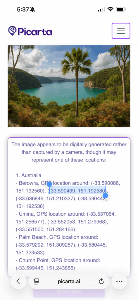 Fascinatingly, Picarta’s first guess was exactly where my AI image was supposed to represent. Not only that, Picarta also detected that the image was digitally generated.